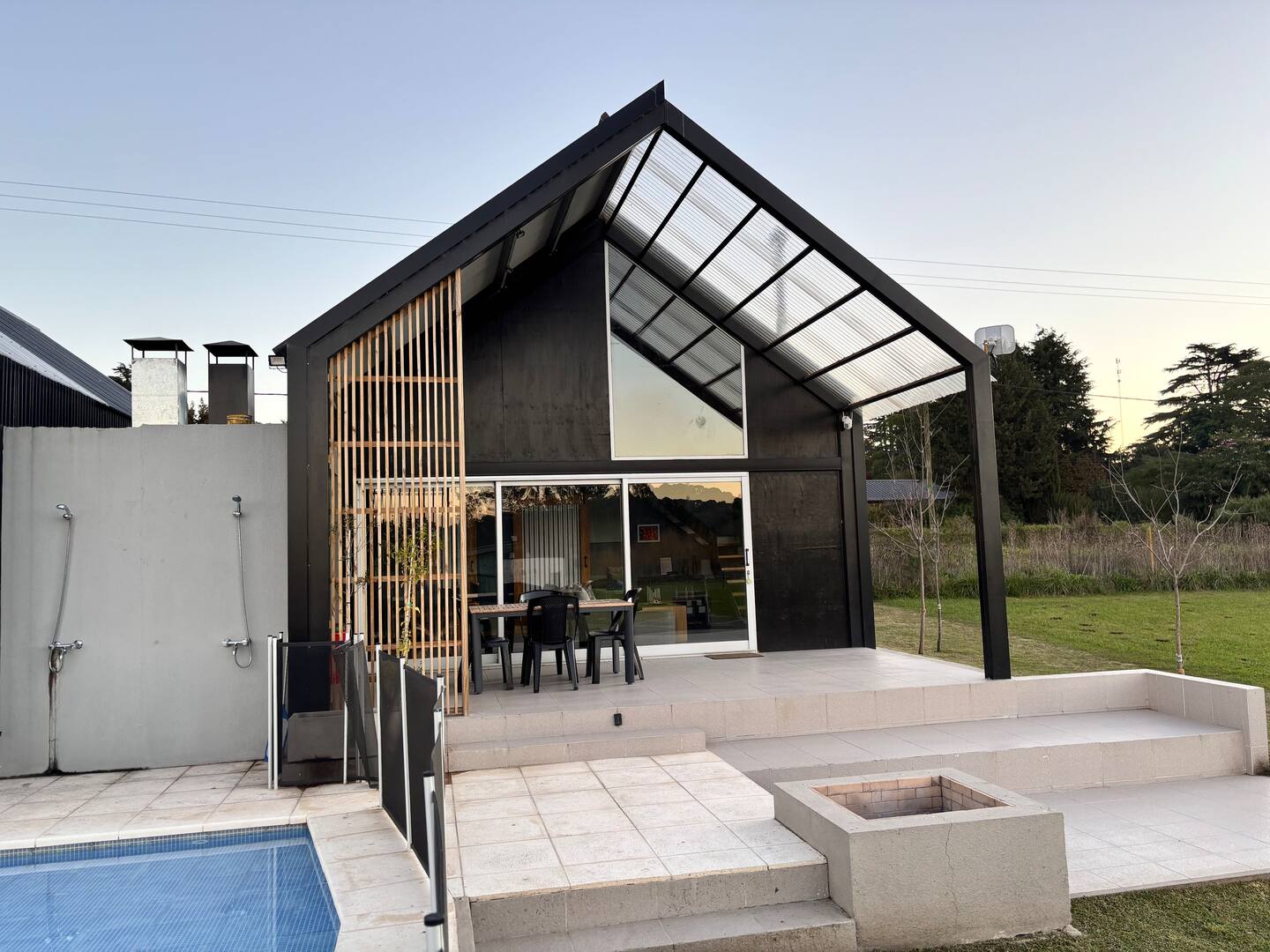 La casa forma parte del Complejo Granero Sierras, junto a otra unidad independiente con la que comparte únicamente la pileta, diseñada para mantener la privacidad de cada alojamiento.