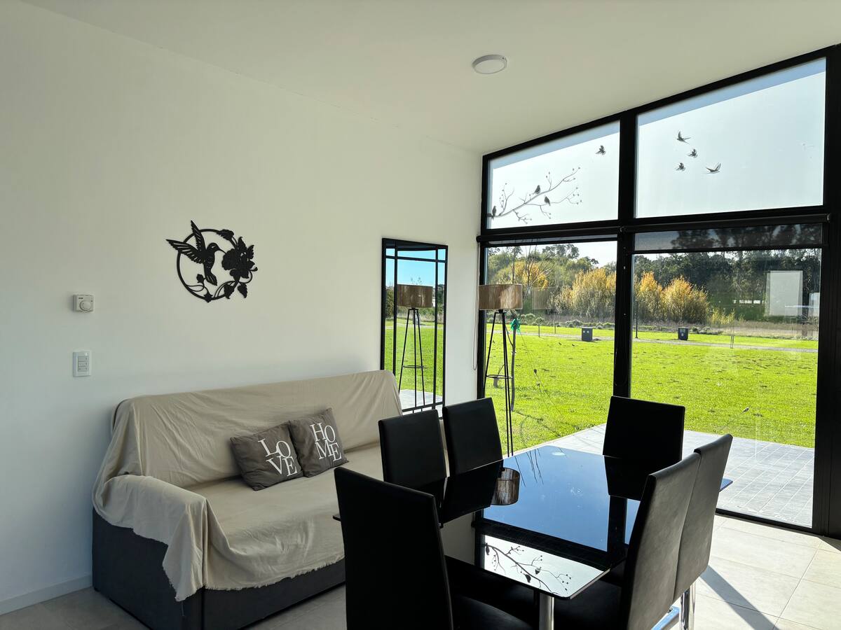 Cuenta con todo lo indispensable para una estadía confortable: dos dormitorios, living amplio, cocina equipada, galería techada con parrilla, jardín privado, aire acondicionado en todos los ambientes y Wi-Fi rápido.
